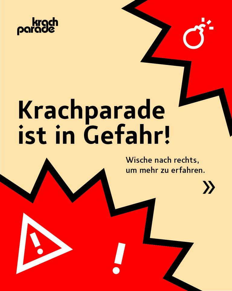 Ob die Parade stattfindet, bleibt also offen. Die Veranstalter:innen rufen aktuell zur Unterstützung auf. Mehr Informationen auf Instagram @krach_parade